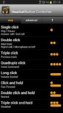 Headset Button Controller is shipped with a powerful default configuration, but you can change almost every action performed. Once you have configured it with your preferences, it runs in the background using almost no CPU. It has been tested with a wide variety of different Android devices and music apps and works with both single-button headsets, and Android-specific 3-button headsets.
