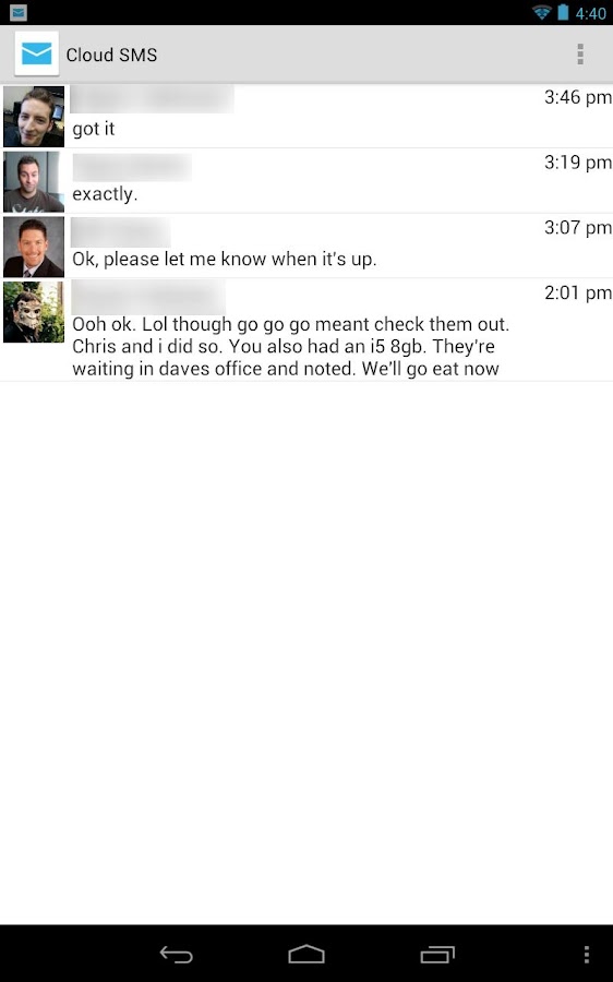 Cloud SMS is run on both your Android phone and tablet to allow you to send and receive SMS messaging from your tablet. My design goal was to build upon the stock Android Messaging app feel, with simplicity in mind.