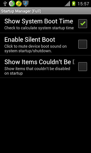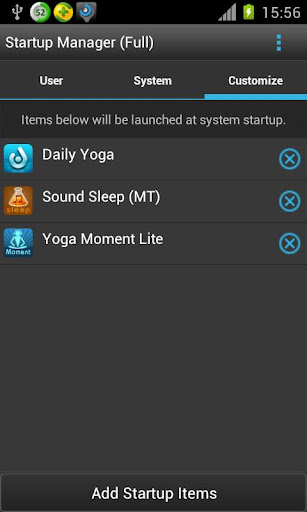 Startup Manager aims at helping disable/enable startup items from system boot for Android devices including smartphones and tablets. To disable an item from system startup, uncheck the application from the list (recheck to restore and it will start again). For other item that do not start with system boot, please use "Customize" to add and enable it to start with system boot.Supported languages: English, Japanese, Korean, Simplified Chinese, Traditional Chinese, Russian, and Indonesian.