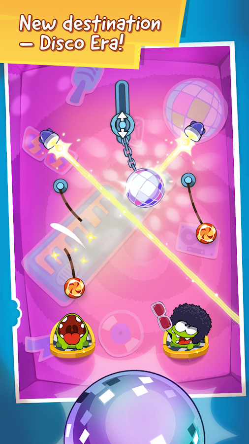 THE GROOVIEST OM NOM YOU’VE EVER SEEN! Om Nom has traveled to the Disco Era to team up with one of his relatives. Cut the ropes and position the new disco ball to stop the spotlight beams from destroying the candy.