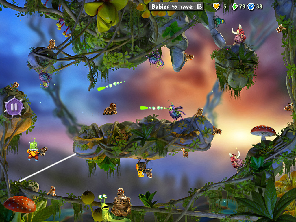 But they have not succeeded just yet... Through their clumsiness they have scattered the thousands of captured babies all over the place. You can help Jupingo save the babies by delivering them to Flash the snail to ferry them out of danger.