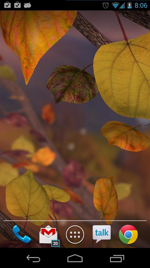 Celebrate fall with a beautiful background of autumn leaves blowing in the wind! A super-sharp foreground and soft focus background has the feel of a macro photograph, while being fully 3D rendered! Works as a daydream on 4.2+ devices!