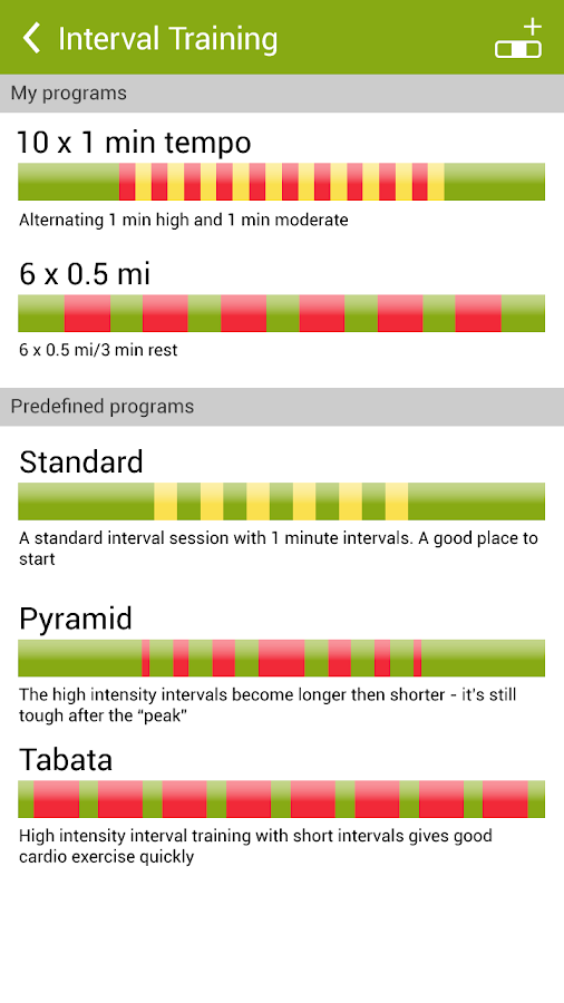 * Interval programs: Choose from three programs or create your own and let the audio coach guide you
