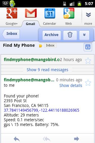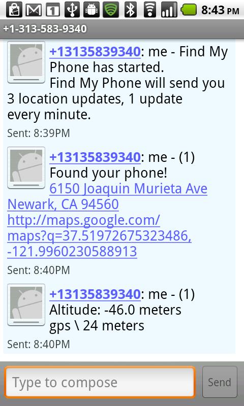 * If you lose your phone, just send it a text message and Find My Phone will reply to you with its current address, and a Google Maps link to your phone's location.