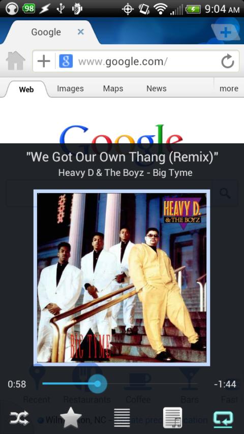 - While using other apps, swipe from the bottom of the screen to reveal the "mini-player" allowing you to control your music & access your now playing list, playlists, and faves without leaving other apps.