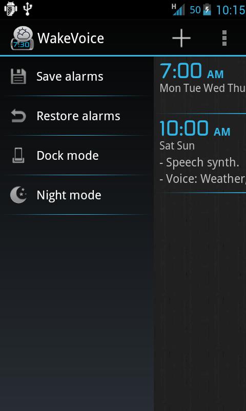 Add to that all the settings imaginable on a clock (programming various alarms over several days, setting names, volume, times...) and you get WakeVoice, the most innovative alarm clock that you can find on the Android market.